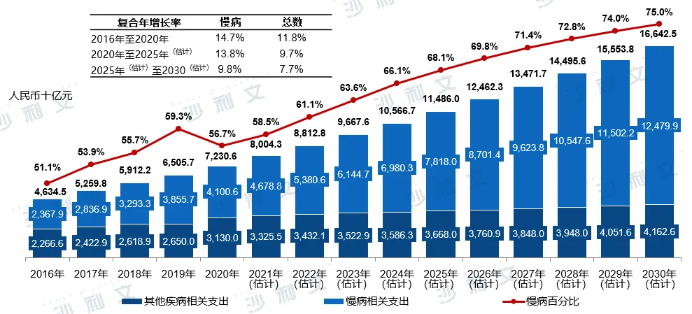 中国的慢病管理市场,拥有庞大的患者群体和高增长潜力,是中国医疗卫生市场最重要的细分市场之一。中国的慢病医疗卫生支出预计将从2020年的人民币41,006亿元(占医疗卫生总支出的56.7%)增长到2030年的人民币124,799亿元(占医疗卫生总支出的75.0%)。