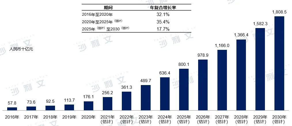 中国数字化慢病管理市场包括慢病管理服务及相关产品销售收入。数字慢病产品包括药物、耗材、医疗器械、营养品及补充品,以及其他慢病用品。中国数字化慢病管理市场的市场规模由2016年的人民币578亿元增至2020年的人民币1,761亿元,期内复合年增长率达32.1%。预期市场规模将由2025年的人民币8,001亿元进一步增长至2030年的人民币18,085亿元,其中2020年至2025年与2025年至2030年的复合年增长率为分别为35.4%及17.7%。