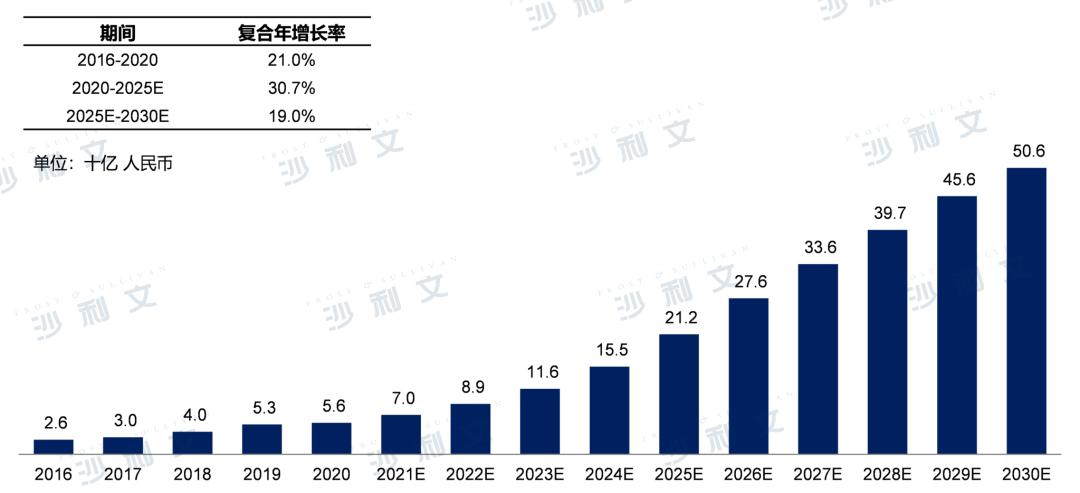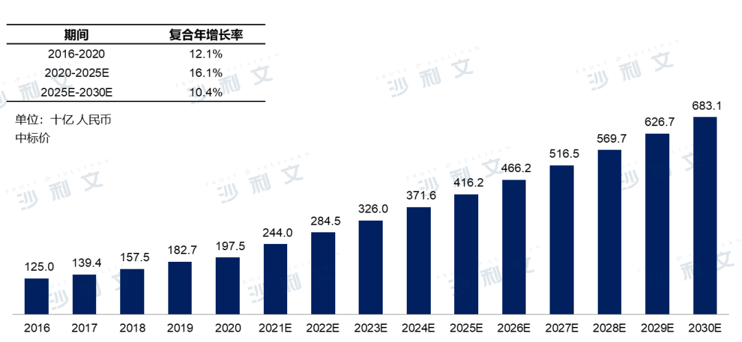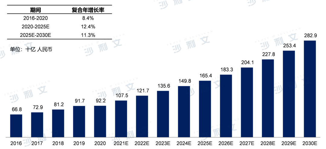 从2016年到2020年,中国代谢疾病药物市场规模在2020年达到人民币922亿元,在过去5年当中的复合年增长率达到8.4%。预计中国代谢疾病药物市场在2025年将会达到人民币1,654亿元,其年复合增长率为12.4%,到2030年达到人民币2,829亿元。