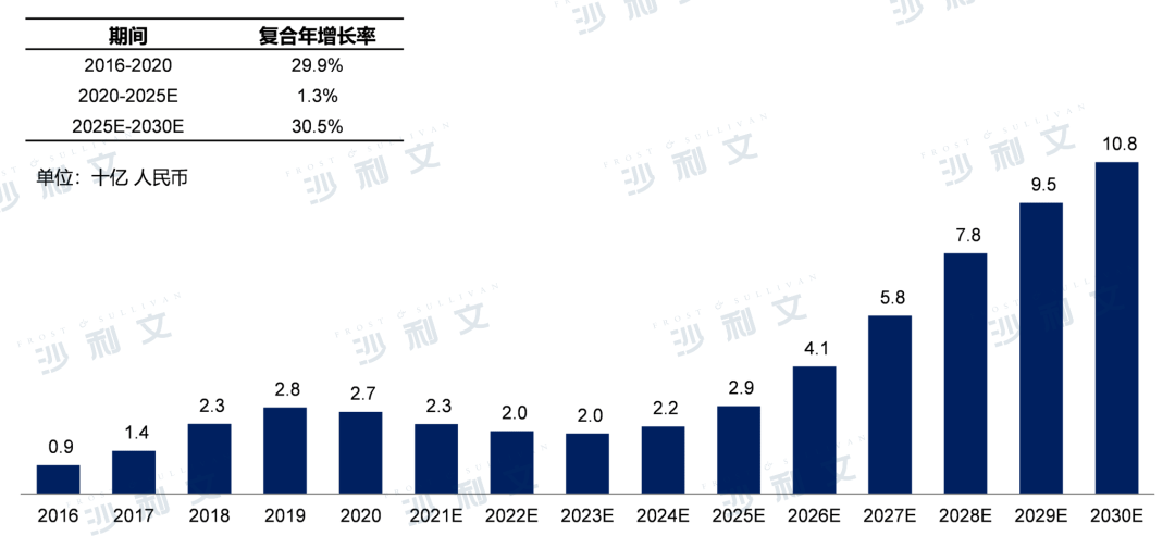 目前中国痛风药物市场规模从2016年的人民币9亿元增长到2020年的人民币27亿元,年复合增长率为29.9%,并且预计到2025年,其市场规模将达到人民币29亿元,年复合增长率为1.3%。至2030年,中国痛风药物市场将进一步增长到人民币108亿元,2025年至2030年的年复合增长率为30.5%。