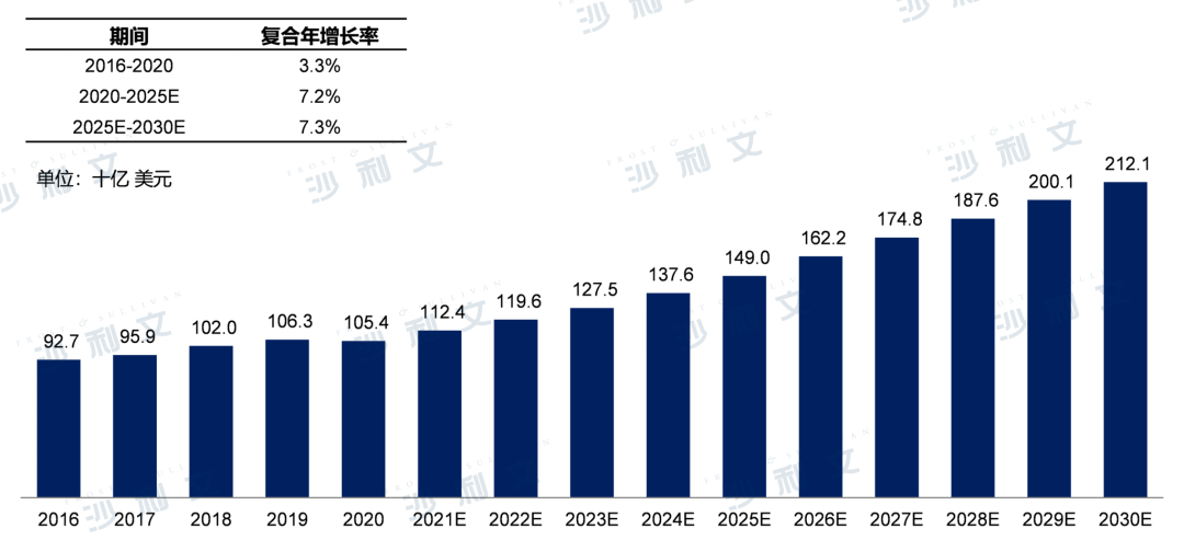 在全球代谢疾病药物市场当中,药物市场规模近年来一直呈现稳步增长趋势。从2016年到2020年,市场规模在2020年达到1,054亿美元,在过去5年当中的复合年增长率达到3.3%。预计全球代谢疾病药物市场在2025年将会达到人民币1,490亿美元,其年复合增长率为7.2%,到2030年达到2,121亿美元。