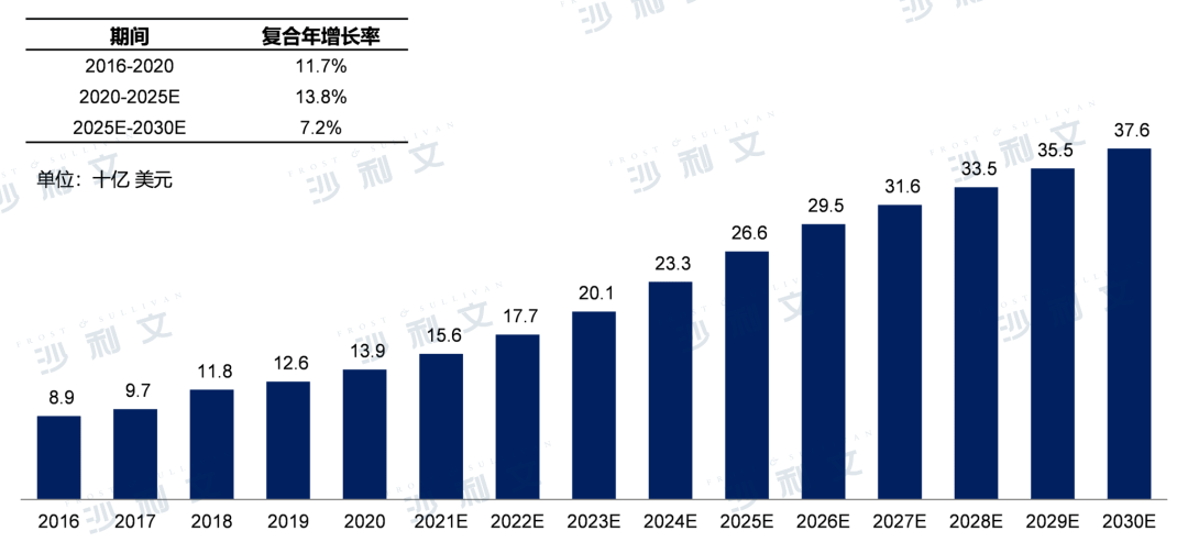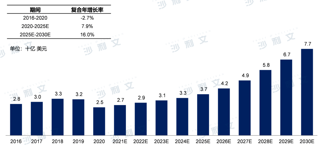 目前全球前列腺癌药物市场规模从2016年的89亿美元增长到2020年的139亿美元,年复合增长率为11.7%,并且预计到2025年,其市场规模将达到266亿美元,年复合增长率为13.8%。至2030年,全球前列腺癌药物市场将进一步增长到376亿美元,2025年至2030年的年复合增长率为7.2%。
