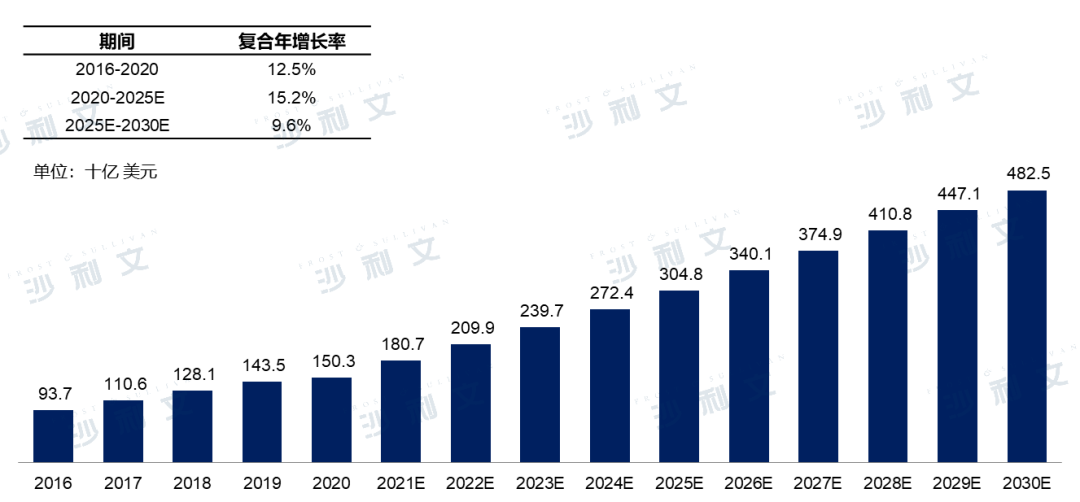 全球抗肿瘤药物市场蓬勃发展,市场规模2020年达到1,503亿美元,预计到2025年,其市场规模将达到3,048亿美元,2020-2025年的复合年增长率为15.2%。至2030年,抗肿瘤药物市场将进一步增长到4,825亿美元,2025年至2030年的复合年增长率为9.6%。