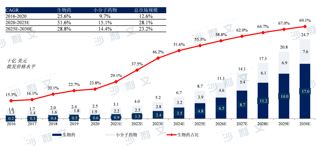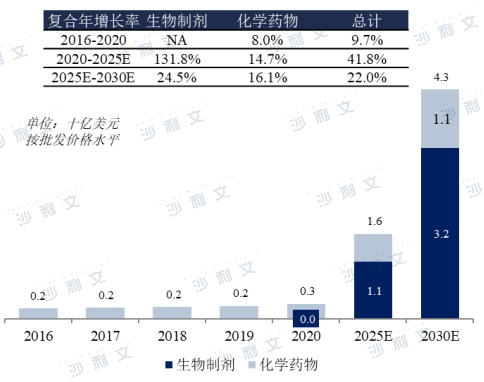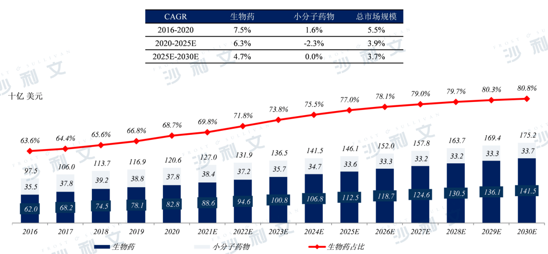 预计全球自身免疫疾病治疗市场将从2020年的1,206亿美元增长到2025年的1,461亿美元,复合年增长率为3.9%,至2030年将增长至1,752亿美元,其中生物药的占比超过80%,生物药的增速高于整体市场。
