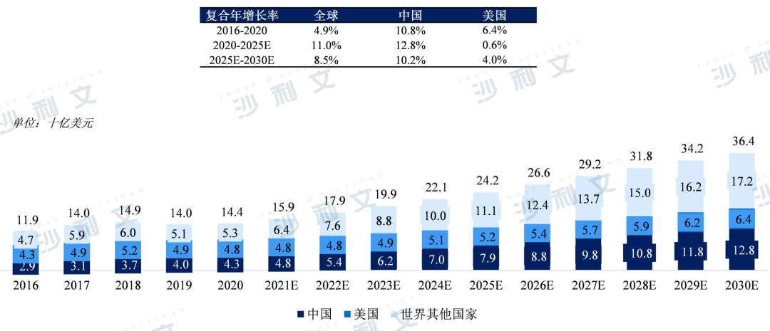 基于中国庞大的人口,中国市场拥有一个庞大的自免疾病患者群,随着我国自身免疫性疾病诊断技术的发展和完善,以及经济发展和人民收入水平的提高,未来几年医疗服务的市场需求将受到刺激。预计2025年整体市场规模将达到87亿美元,2020年至2025年的复合年增长率为28.1%,自2025后保持20%以上的复合年增长率,至2030年市场规模将达到247亿美元。