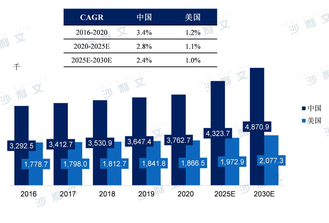 从2016年到2020年,美国湿性老年性黄斑变性患者数量从177.87万增加到186.65万,年复合增长率为1.2%。在中国,湿性老年性黄斑变性的患病人数从2016年的329.25万例增长至2020年的376.27万例,复合年增长率为3.4%,预计到2025年将进一步增长至432.37万例,2020年至2025年的复合年增长率为2.8%。