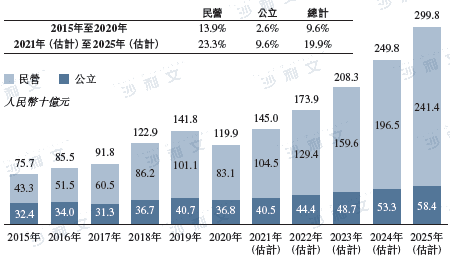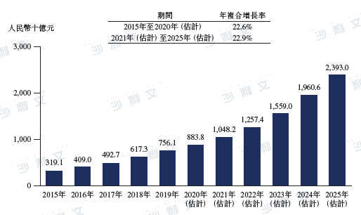 可支配收入的增长及健康意识的提高,促使医疗市场由疾病驱动的市场(即治疗已经生病的人)转型为健康驱动的市场(即提供医疗服务以积极改善中国消费者的健康水平)。中国消费型医疗服务的总市场规模由2015年的人民币3,191亿元扩大至2020年的人民币8,838亿元,年复合增长率为22.6%。2021年至2025年,预期将以22.9%的年复合增长率加速增长,到2025年底达到人民币23,930亿元。