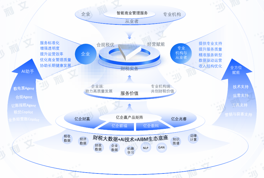 中小微企业财税服务需求升级驱动行业向智能商业管理解决方案转型。纵向角度来看,企业需融合税务规划与商业战略,保障企业长效发展;横向发展看,行业正加速生态整合,依托AI、大数据、云计算等技术构建智能化服务平台,全面提升服务效能,推动行业实现智能化升级与可持续发展。