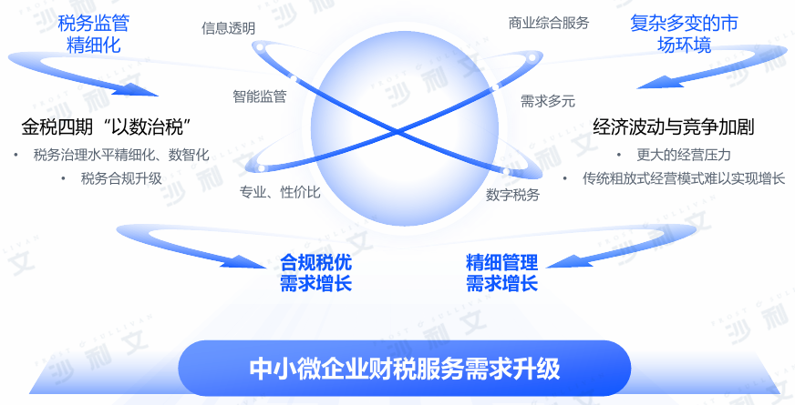近年来,随着数字经济的快速发展,税务监管日趋精细化,中小微企业对财税合规性、效率优化及智能化管理的需求不断提升,正在孕育一个千亿级别的财税服务需求市场。然而,我国财税服务行业的传统服务模式已难以满足中小微企业日益增长的个性化需求,行业整体面临基础服务价值弱化、同质化竞争加剧、专业服务人才短缺以及转型升级艰难等困境。