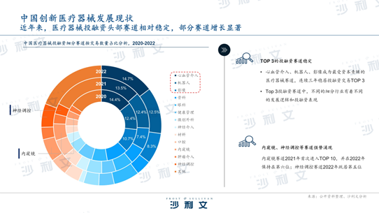 毛化随后分享了 中国医疗器械产业的发展机会,他表示 , 近年来,医疗器械投融资头部赛道相对稳定,部分赛道增长显著:心血管介入领域正从术式、材料、技术等多个维度革新 ;医疗影像领域中,大数据、智能化AI、术中影像融合技术应用趋势显著; 机器人时代正颠覆各类传统手术,并呈现信息化、智能化、微创化等发展趋势; 神经调控技术不断拓展应用领域,逐步向数字化、微型化、可远程调节、无线无电池的方向发展。