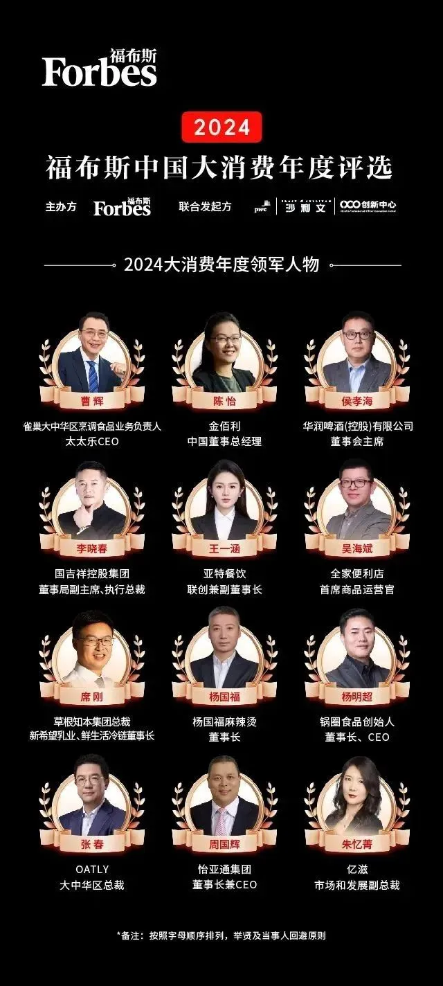 这些入选者不仅代表着中国大消费行业的中坚力量,他们富有创新思维、顺应时代潮流的经营和发展思路也将为这个行业中的其他企业和领导者所借鉴。福布斯中国将持续关注大消费领域,希望能看到越来越多的优秀企业和个人凭借更为敏锐的市场洞察力和更加卓越的创新能力,为促进中国乃至世界的商业进步贡献力量和价值。
