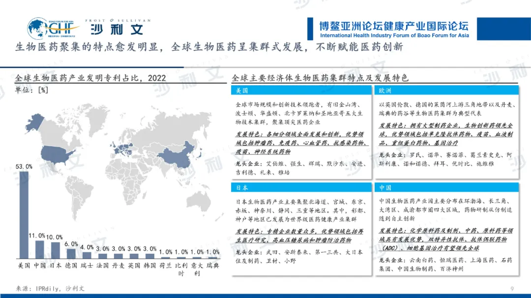 从地域分布看,全球生物医药呈集群式发展。从生物医药的发明专利来看,美国、中国、日本及欧洲是全球主要的专利贡献国,且这些国家的生物医药产业聚集效应也愈发明显。