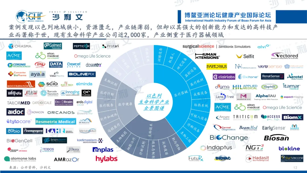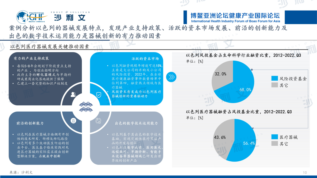 以色列地域狭小,资源匮乏,产业链薄弱,但却以其强大的创新能力和发达的高科技产业而著称于世。作为世界公认的生命健康领域领先国家,以色列现有生命科学产业公司近2,000家。通过对这些企业进行全景梳理,沙利文发现其生命科学产业可分为医疗器械、生物技术、数字健康和药物治疗四大领域,产业侧重于医疗器械领域,其在医疗器械创新上具有显著优势,此外,有力的产业支持政策、活跃的资本市场发展、前沿的创新能力及出色的数字技术运用能力是以色列器械创新的有力推动因素。