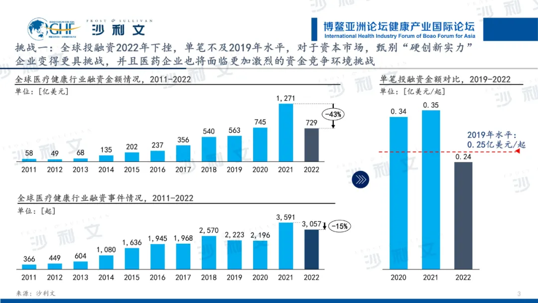 第一个挑战来自于外部资金环境。2022年开始,由于地缘政治冲突、能源紧缺、新冠疫情、通胀高企等因素影响,全球医疗健康行业资本市场出现了较大幅度的回落。2022年,全球医疗健康产业共发生3,057起融资事件,较2021年下降43%,整体趋于冷静和审慎。