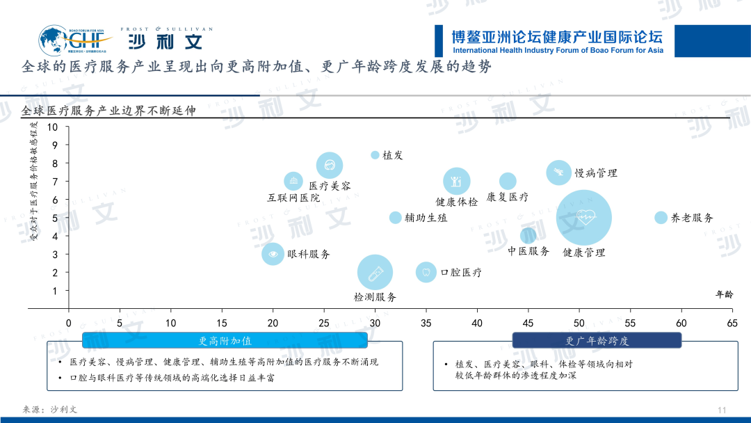 纵观全球医疗服务领域,全球的医疗服务产业呈现出向更高附加值、更广年龄跨度发展的趋势。医疗美容、慢病管理、健康管理、辅助生殖等高附加值的医疗服务不断涌现,口腔与眼科医疗等传统领域的高端化选择日益丰富;在社会等一系列因素的作用下,植发、医疗美容、眼科、体检等领域向相对较低年龄群体的渗透程度加深。