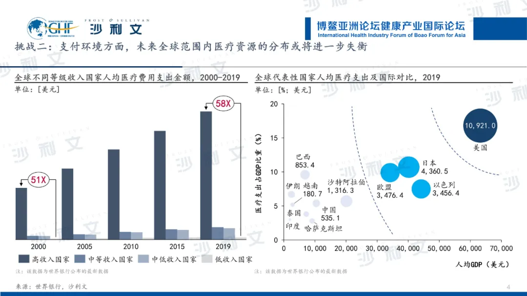 第二个挑战则是在支付环境方面。从收入层级看,不同等级收入国家的人均医疗费用支出金额差距进一步扩大,高收入国家与低收入国家差距已从2000年的51倍扩大到了2019年的58倍。从具体经济体看,全球代表性国家已经逐步形成了明显的两极分布,富有的国家人均医疗支出金额远大于低收入国家,例如,2019年美国人均医疗支出约为中国人均医疗支出的20.4倍,是越南的60.4倍。全球医疗服务资源的分布与地区经济呈现正向关联,发达地区高的医疗支出使得患者在医疗健康方面获得更加前沿的治疗,低收入地区更多的是维持最基本的必需药品和就诊服务,预期未来全球范围内医疗资源的分布或将进一步失衡。