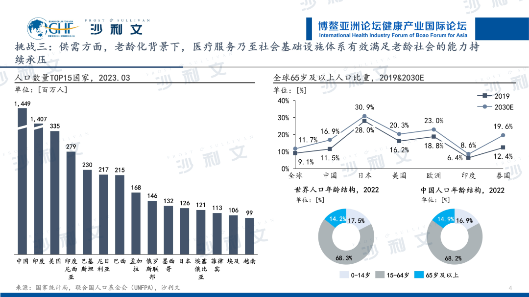 最后一个挑战来自于供需方面。受城市化发展、医疗水平提高、人类寿命逐渐延长等因素推动,世界人口高速增长,人口老龄化已是世界人口发展的必然趋势,其中发展中国家老龄化增速明显。人口老龄化程度加深,意味着未来需求端对医疗健康服务会有更高数量与质量上的要求,因此,以往定位于年轻群体的医疗服务乃至社会基础设施体系将难以有效满足老龄社会的需求下所带来的严峻的诊疗需求。