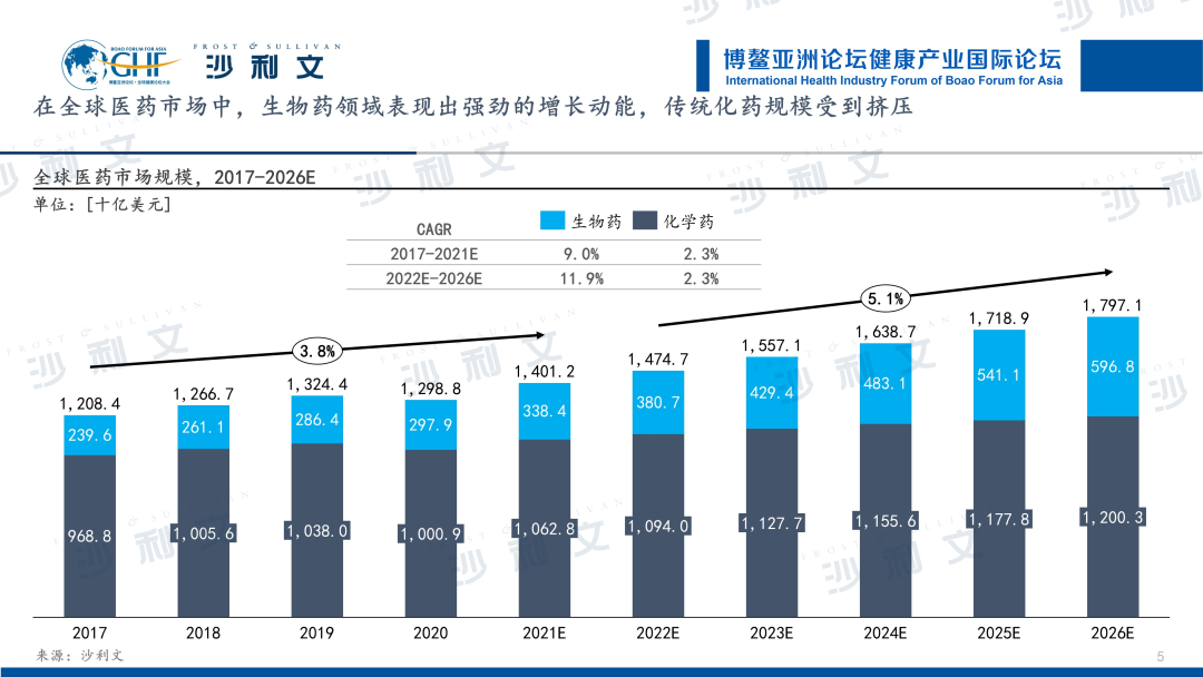 纵观全球医药市场,生物药领域表现出强劲的增长动能,传统化药规模受到挤压。数据显示,全球医药市场规模从2017年的1.2万亿美元增长至2021年的1.4万亿美元,CAGR约为3.8%。预计到2026年将达到1.8万亿美元,全球医药市场保持稳定增长。从医药市场的两种药物类型看,生物药相比于化学药具有全新的治疗理念,为治疗癌症、银屑病等疑难杂症提供了新的思路,目前增速水平远高于化学药。未来,随着生物药疗效增强、生物技术发展及研发投入增加和生物药批准不断增加等因素驱动,预计全球生物药2022-2026年的复合年增长率为11.9%,仍将显著领先于化学药的2.3%。