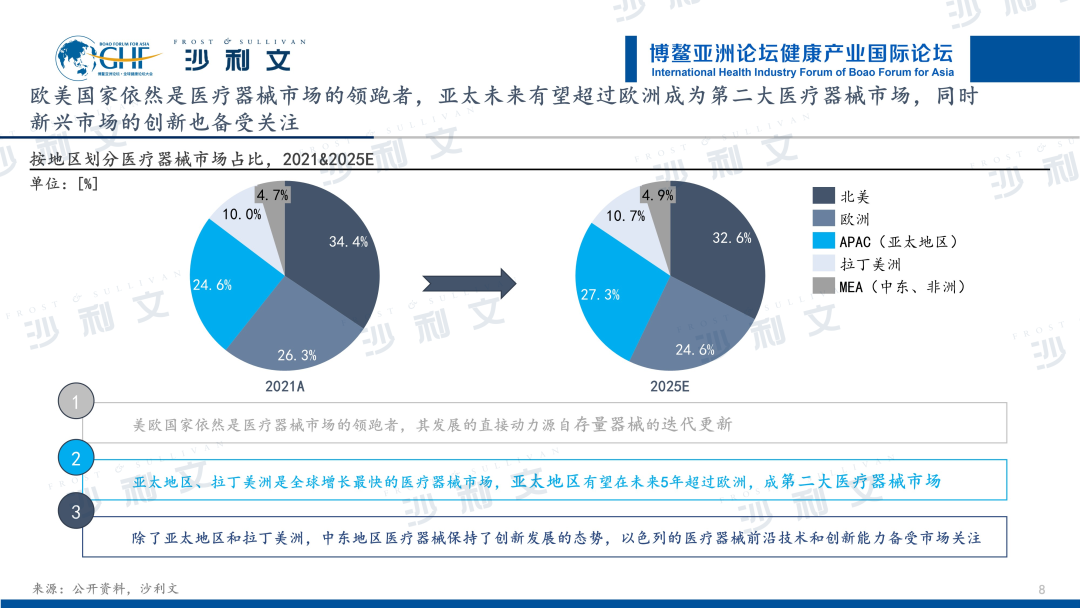 纵观全球医疗器械市场,欧美国家依然是医疗器械市场的领跑者,亚太未来有望超过欧洲成为第二大医疗器械市场,同时新兴市场的创新也备受关注。
