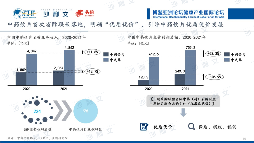 中药饮片方面,李政介绍道,中药饮片首次省际联采落地,将引导优质优价发展。国家2018年清理整顿医药行业,共收回224张GMP证书,其中,中药饮片行业收回96张,占总量的比重高达43%。2020年,药监局颁布《关于促进中药传承创新发展的实施意见》,鼓励中医药发展,政策推动下中药饮片迎来发展机遇。2021年中药饮片主营业务收入2057亿元,同比增长13.7%;利润总额249.3亿元,同比增长106.9%;相比占据约70%市场份额的中成药,中药饮片增幅具有明显优势,反映良好增长势头。中药饮片的联采更多结合行业特性,提出“保质、提级、稳供”的思路,不以降价为主要目的,注重体系与标准建设。