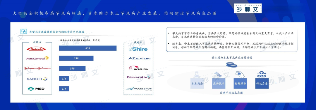 除此之外,大型药企也在积极布局罕见病领域,如武田制药花费高达650亿美元收购了英国制药商夏尔(Shire);且近年来,资本不断涌入罕见病药物研发、创新生物技术平台、互联网科技以及创新医疗服务领域等,推动了罕见病生态圈的构建,各资源相互协同,为罕见病产业链注入了活力。