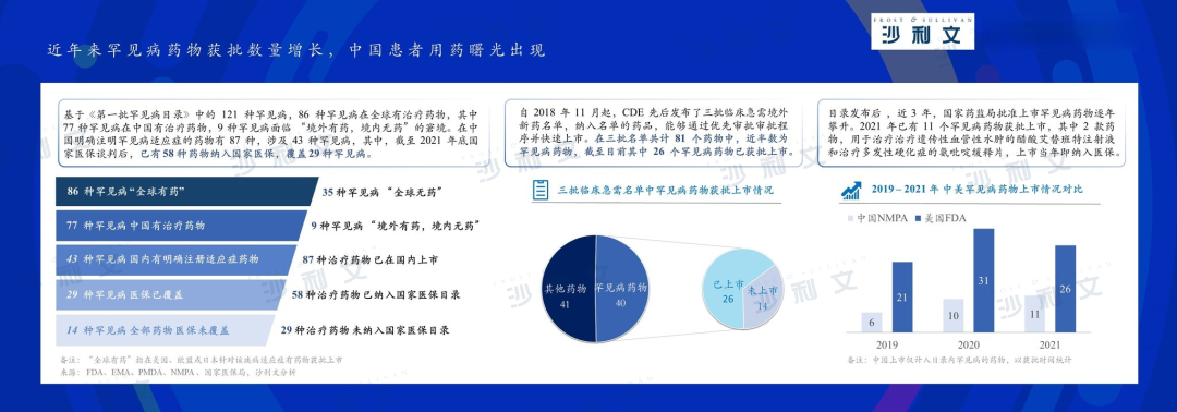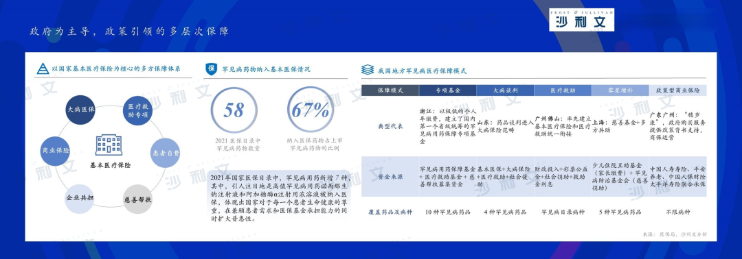 2021年国家医保目录中,罕见病用药新增 7 种,其中,引人注目得是高值罕见病用药诺西那生钠注射液和阿加糖酶α注射用浓溶液被纳入医保,体现出国家对于每一个患者生命健康的尊重,在兼顾患者需求和医保基金承担能力的同时扩大普惠性。据沙利文调研显示,我国目前正在逐步构建以政府为主导,以国家基本医疗保险为核心的多方保障体系,上海、浙江、山东、以及广东的佛山、广州等地区纷纷建立了不同的地方性罕见病医疗保障模式。