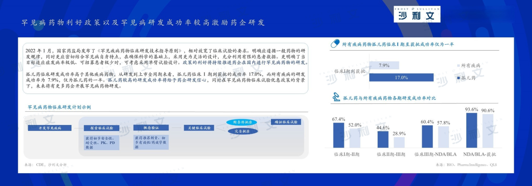 2022 年 1 月,国家药监局发布了《罕见疾病药物临床研发技术指导原则》,相对放宽了临床试验的要求,利好政策将持续推进药企进行罕见病药物研发;此外,孤儿药临床研发成功率高于其他疾病药物,从研发到上市全周期来看,孤儿药临床I期到获批的成功率17.0%,而所有疾病的研发成功率为7.9%,仅为孤儿药的一半,较高的研发成功率也将给予药企研发信心,激励企业开展罕见病药物研发。