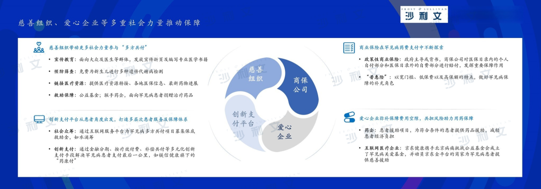 目前,多重社会力量都在不断推动罕见病药物保障,如慈善组织带动更多社会力量参与“多方支付”;创新支付平台从患者角度出发,打造多层次患者服务及保障体系;商业保险也在罕见病药费支付中不断探索;爱心企业则弥补保障费用空隙,共担风险助力用药保障。