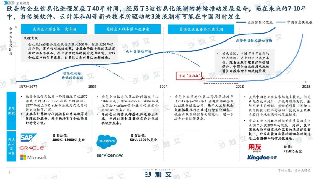 沙利文研究发现,企业级SaaS服务是在欧美工业化200年、信息化20年以后开始的,客户相对比较成熟,且由于欧美经济高速发展红利基本耗尽,企业管理效率的提升变为刚需,所以企业客户的付费意愿、付费能力和付费认知都较高。相比美国,虽然中国企业服务市场起点较低,但中国市场有更高的经济增速、更大的企业客户基数,且正处在效率提升、产能升级的时代,加上供给侧优化改革政策的推动,使得我国企业服务获得平地起高楼的发展速度。数据显示,中国2020年数字经济规模达39.2万亿元,占GDP比重超过38%,企业在数字化转型的支出呈不断增长态势,预计到2025年企业IT支出将达3.4万亿元。“中国工业化曾用40年时间的发展成功追上美国工业化200年的发展,我们相信,在中国庞大的市场需求和完备的基础建设前提下,中国有能力用10年时间追赶上美国40年的信息化发展。”张朔禹说道。