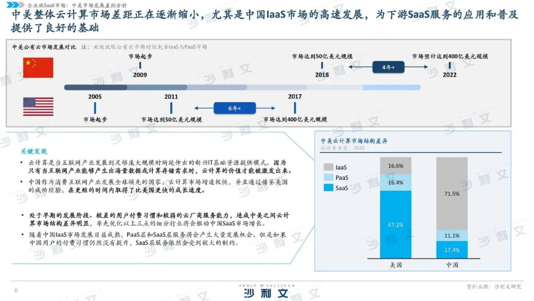 此外,纵观中美整体公有云市场发展,美国的市场起步于2005年,2011年市场达到50亿美元的规模,而后仅仅六年,整个市场规模呈爆发式增长,2017年整体市场规模达到了400亿美元。中国的公有云市场起步于2009年,2018年时发展至50亿美元,预计2022年整体市场规模将达400亿美元。中美整体云计算市场差距正在逐渐缩小,尤其是中国IaaS市场的高速发展,为下游SaaS服务的应用和普及提供了良好的基础。