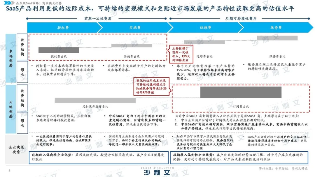 张朔禹指出,企业级SaaS市场,SaaS产品利用更低的边际成本、可持续的变现模式和更贴近市场发展的产品特性,能够获取更高的估值水平。SaaS产品包括了前期一次性费用及后续可持续性费用两部分,前期收入偏向性企业拥有盈利风险更低、投资者回报周期更短、客户企业IT预算更好获批的优势,而后期收入偏向性企业则具有客户企业更低的付费心理门槛、对于用户痛点更准确的把握、更好的可持续发展能力、对产品未来盈利性更好的预估等优势。