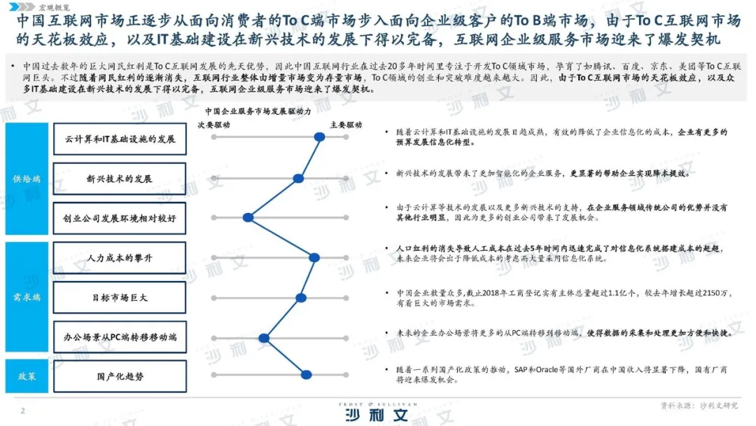 张朔禹表示,中国互联网市场正逐步从面向消费者的To C端市场步入面向企业级客户的To B端市场。中国过去数年的巨大网民红利是To C互联网发展的先天优势,因此中国互联网行业在过去20多年时间里专注于开发To C领域市场,孕育了如腾讯、百度、京东、美团等To C互联网巨头。不过随着网民红利的逐渐消失,互联网行业整体由增量市场变为存量市场,To C领域的创业和突破难度越来越大。因此,由于To C互联网市场的天花板效应,以及众多IT基础建设在新兴技术的发展下得以完备,互联网企业级服务市场迎来了爆发契机。