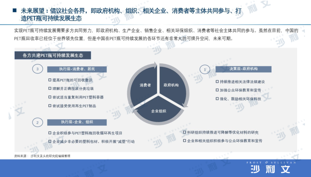 我们倡议——社会各界,即政府机构、相关企业、组织、消费者等主体,共同参与打造PET瓶可持续发展生态。政府机构根据中国的国情,出台有利于空瓶回收的政策法规;相关企业与组织可加强环保合作交流;消费者应积极接受公众教育,提高主动回收意识。