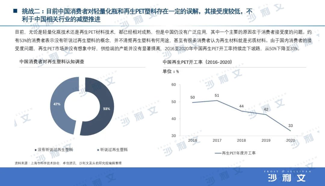 挑战二,消费者对轻量化瓶和再生PET接受度低。随着经济的发展,中国消费者对产品的品质提出了更高的要求,对克重较轻、手感偏软的轻量化瓶接受度逐渐降低。消费者甚至错误的将使用轻量化瓶和再生PET产品视为假冒伪劣产品,并会产生“商家在偷工减料”的误解,这对行业“减塑”进度都比较不利。