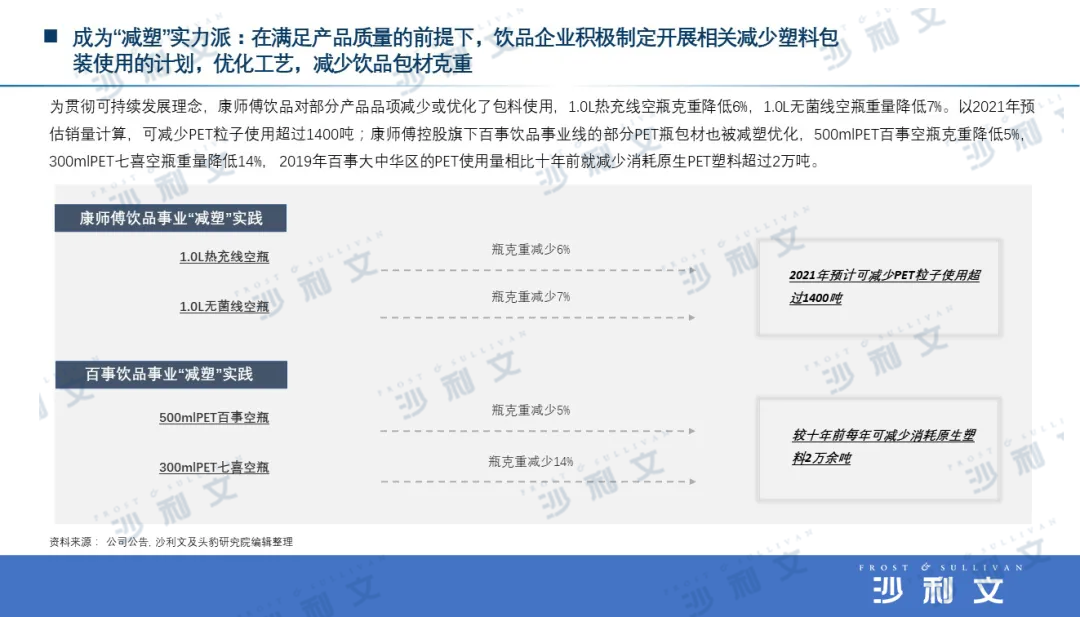 在“减塑”行动上,各类饮品企业也是积极制定开展相关减少塑料包装使用的计划,优化工艺,减少饮品包材克重,其中,康师傅饮品和百事饮品事业线中均有各项“减塑”实践,并取得了相应的节能减排成果。