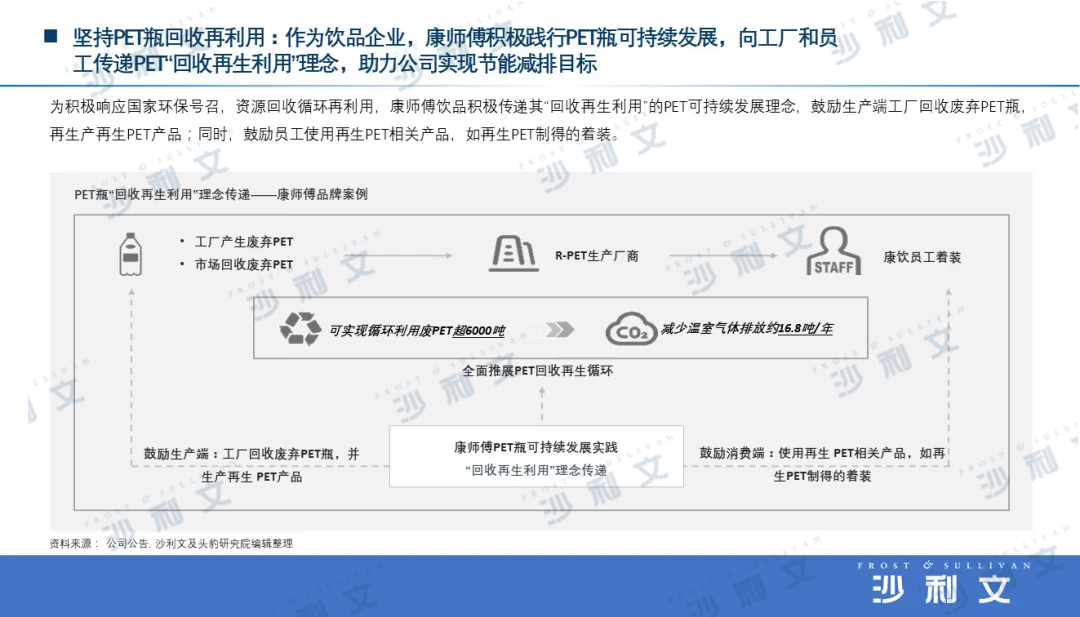 在PET瓶的回收再利用实践案例中,为积极响应国家环保号召,资源回收循环再利用,康师傅饮品积极传递其“回收再生利用”的PET可持续发展理念,鼓励生产端工厂回收废弃PET瓶,制得再生PET产品;同时,鼓励员工使用再生PET相关产品,如由再生PET制得的着装。康师傅饮品已与威立雅公司达成品牌合作,后续康饮各供应链部拟全面推展PET回收再生循环方案,每年约超过6,000吨废PET循环利用,可实现减少16.8吨温室气体排放。