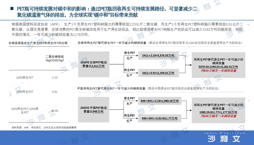 可以看到,通过PET瓶回收再生可持续发展路径,可显著减少二氧化碳温室气体的排放,这将为实现全球“碳中和” 目标带来巨大贡献。
