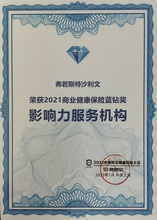 大会组委会对商业健康保险领域各类参与主体,进行了深入的调研与全面的评估,对沙利文对行业做出的相关研究和洞察给予了高度的认可和赞许,认为其研究对行业的发展及业内参与方的增长起着重要的指引作用,决定授予弗若斯特沙利文2021商业健康保险蓝钻奖——影响力服务机构。