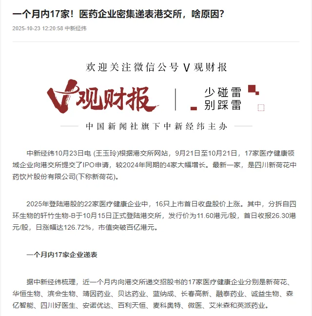 根据港交所网站上发布的信息,2025年9月20日至10月20日,一个月间向港交所提交上市材料申请IPO的医疗健康领域企业达14家,相比同期数量增长实现翻倍。怎么看这一现象?这是什么原因造成的?在IPO企业中,还包括了多家A股公司,为什么这些公司会在此刻谋求港股上市,多地上市有哪些好处?